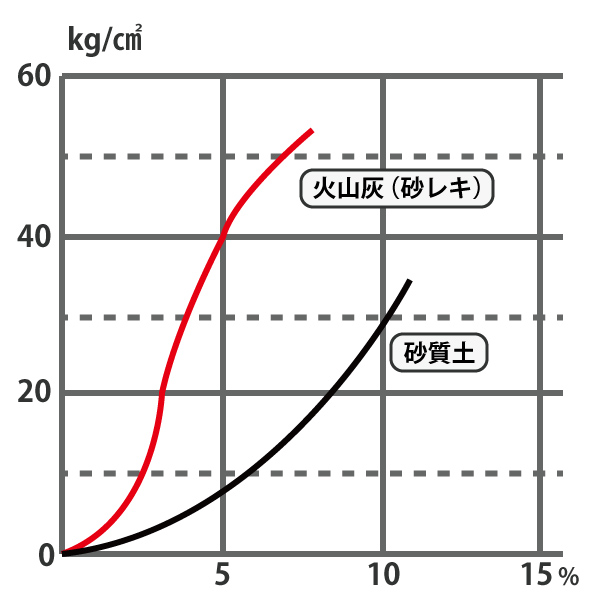 なお一例として路盤に使用しますと、30kg/㎠の強度を目標として、その使用する骨材(土)により左図の様になります。ここで配合を決定するのですが、火山灰(レキ混じり砂質)で4%、砂質土で10%となるのです。