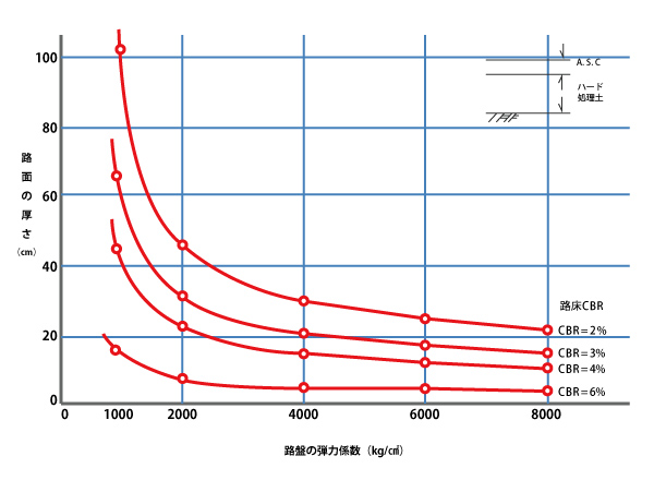 ラトナ・ソイルハードナーP%、土壌の乾燥単位重量γd’/㎠、ラトナ・ソイルハードナー処理層の厚さをh cmとすれば1㎡当たりのラトナ・ソイルハードナー重量Wkgは W=h・γd’・(P/100+P)・1000 (kg)であらわされます。