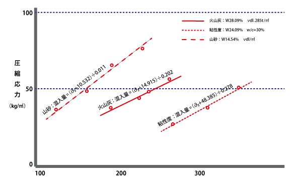 1週間程度で30kg/㎠・40kg/㎠または50kg/㎠、これに対する配合量を現場採集の土を用いた試供体による室内試験で確かめ、次にさらなる現場施工による変動係数および現場施工における含水比管理の限界と混合方法の違いなどによる強度低下を考慮した現場修正係数を用いて、最終配合量を決定します。