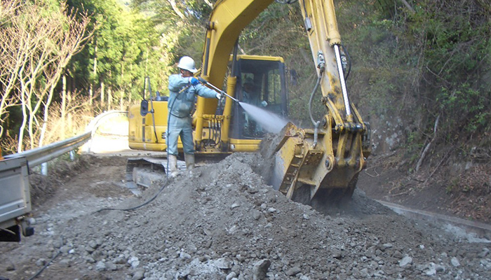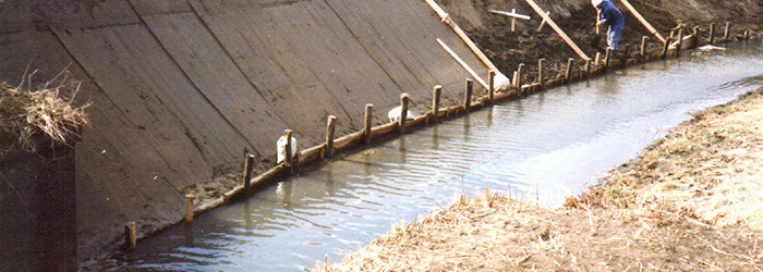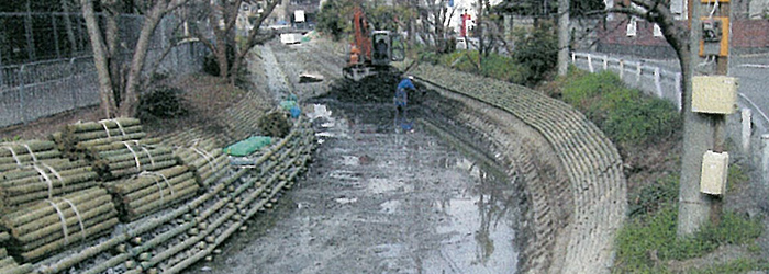 これまで、このような著しく水量の多い現場では、セメントを固化させる工事は困難を極めました。しかし、ラトナ・ソイルハードナー工法は、透水性を活かした用途(沼地地盤改良・他)、またその逆の不透水層を作り利用する用途(用水路・貯水池・他)など、水辺の様々な工事に利用できます。